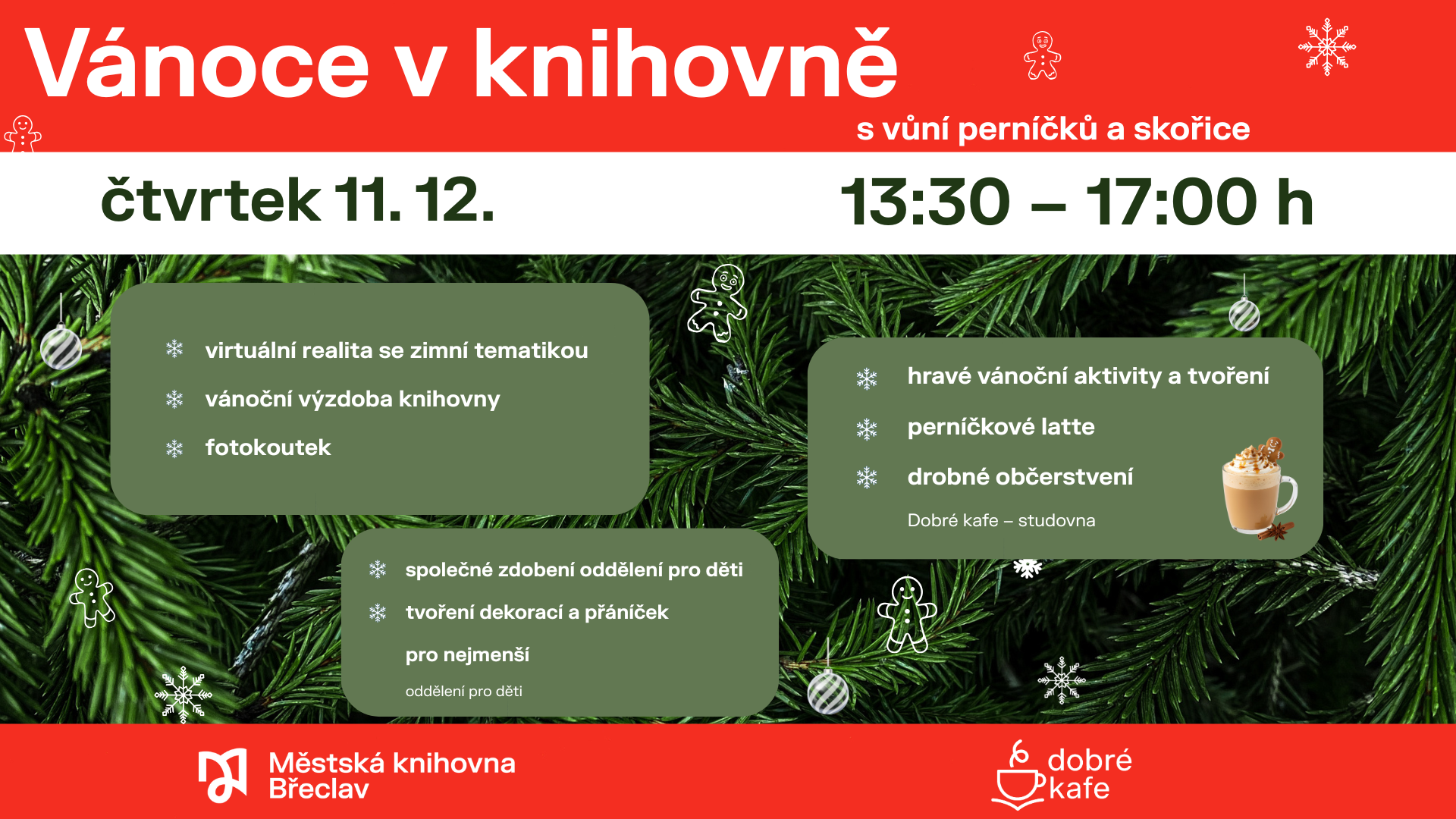Odpoledne zahalí knihovnu vůně perníčkového latte a přinese s sebou spoustu vánočních aktivit, tvoření, výstavu betlémů, fotokoutek, VR se zimní tematikou pro dospělé i pro děti.
