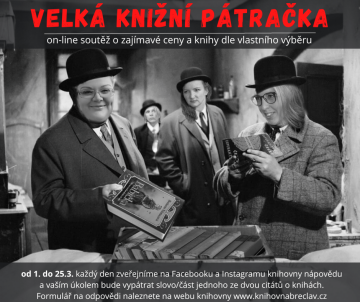 - Každý den bude na Facebooku a Instagramu Městské knihovny Břeclav zveřejněna indicie z jedné knihy, kterou máme v knihovně. Většina z knih se dá prohlížet i online na internetu, ale asi nejjednodušší je zastavit se v břeclavské knihovně a pátrat přímo na regálech.