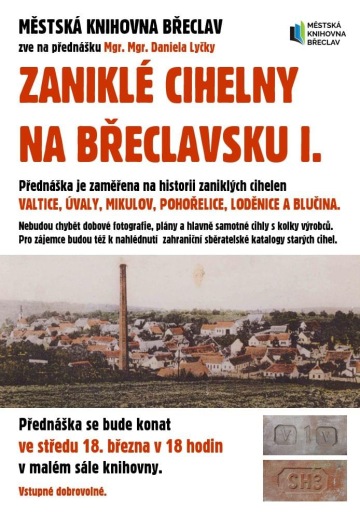 V první přednášce, která se bude konat ve středu 18. března od 18 hodin v malém sále knihovny představí historii cihelen Valtice, Úvaly, Mikulov, Pohořelice, Loděnice a Blučina a ve středu 1. dubna od 18 hodin to budou zaniklé cihelny Lednice, Bulhary, Drnholec, Vlasatice a Dolní Dunajovice.