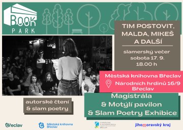 sobota 17.9./18:00 slamerský večer Tim Postovit – Magistrála a Motýlí pavilon, 19:00 Slam Poetry Exhibice Tima Postovita, Maldy, Mikeše…