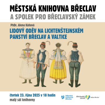 Městská knihovna Břeclav a Spolek pro břeclavský zámek zvou všechny zájemce na další přednášku z cyklu Historie břeclavského hradu a zámku. Tentokrát nám PhDr. Alena Káňová představí, jakými proměnami prošel lidový oděv na lichtenštejnském panství Břeclav a Valtice, tedy v dnešní západní a jižní části etnografického regionu Podluží. Přednáška se uskuteční ve čtvrtek 23. října 2025 v 18 hodin v malém sále knihovny, vstup volný.