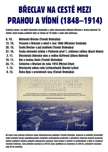 Srdečně zveme i na další historické přednášky z cyklu věnovaného dějinám Břeclavi v druhé polovině 19. století. Ty budou probíhat vždy ve středu od 18 hodin v malé sále knihovny. Zde je plánovaný rozvrh přednášek:
