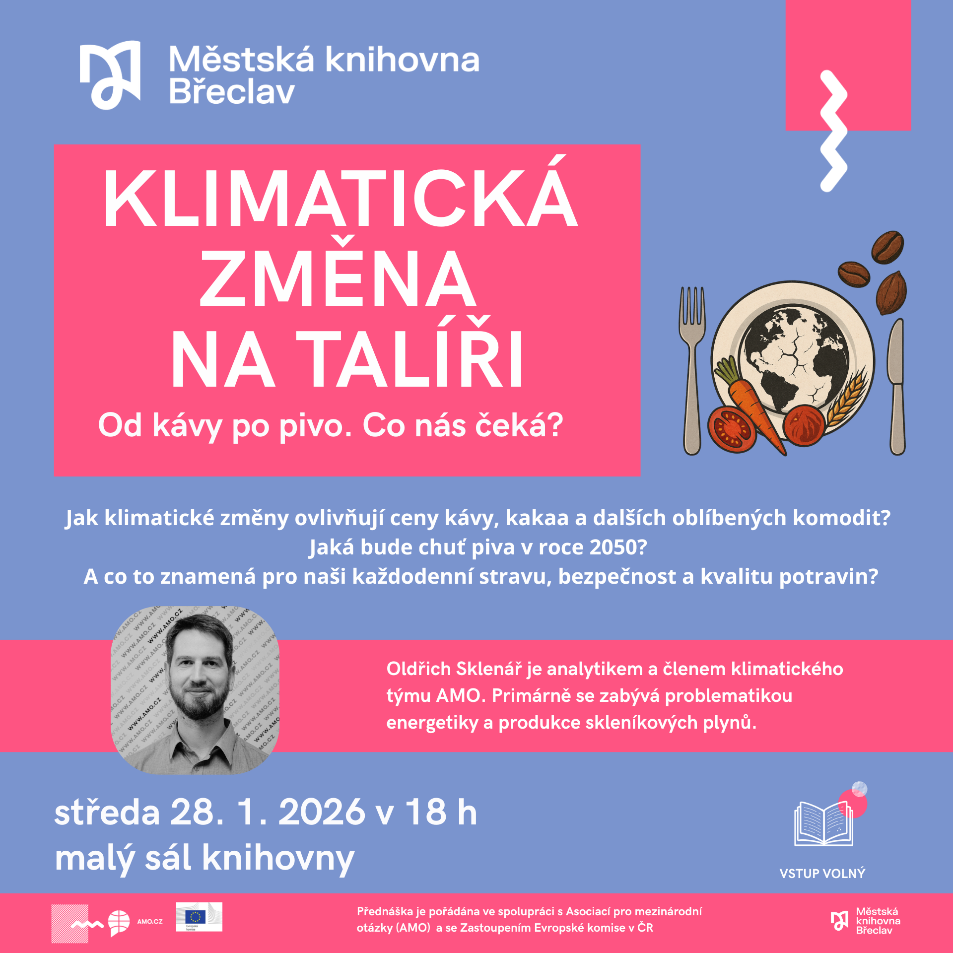 Ve středu 28.1. 2026 v 18 hodin zveme do malého sálu na přednášku Oldřicha Sklenáře Klimatická změna na talíři: od kávy po pivo – co nás čeká? Zajímá vás, jak klimatické změny ovlivňují ceny kávy, kakaa a dalších oblíbených komodit? Jaká bude chuť piva v roce 2050? A co to znamená pro naši každodenní stravu, bezpečnost a kvalitu potravin?