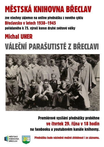 Původně plánovaná přednáška PhDr. Miroslava Geršice Rod Lichtenštejnů za druhé světové války se prozatím odkládá. Namísto toho budete moci zhlédnout odloženou přednášku Michala Uhra Váleční parašutisté z Břeclavi. Přiblíží nám v ní osudy parašutistů z Břeclavi a okolí vysazených za druhé světové války na území protektorátu Čechy a Morava.