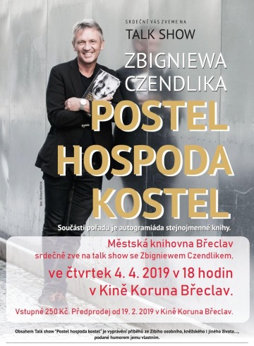 Břeclavská knihovna srdečně zve všechny zájemce na talk show se Zbigniewem Czendlikem nazvanou Postel hospoda kostel, která se uskuteční ve čtvrtek 4. dubna v 18 hodin v Kině Koruna Břeclav. Čeká vás vyprávění tohoto pohodového a zábavného kněze z Lanškrouna, skládající se z příběhů z jeho života osobního i jiného, podané humorem jemu vlastním. Stejnojmenná kniha Zbigniewa Czendlika a Markéty Zahradníkové vyšla v říjnu 2016 a v následujícím roce obdržela cenu čtenářů v rámci soutěže Magnesia litera. Součástí pořadu bude autogramiáda,