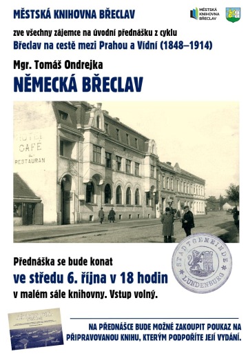 Úvodní historická přednáška z cyklu věnovaného dějinám Břeclavi s názvem „Břeclav na cestě mezi Prahou a Vídní (1848-1914)“. V letošním roce plánuje knihovna vydat publikaci pod stejným názvem. Tomáši Ondrejkovi se podařilo shromáždit velké množství dosud nepublikovaného materiálu, vycházejícího především z původních německy psaných pramenů. Na přednášce bude možné si zakoupit poukaz, kterým vydání chystané knihy můžete podpořit.